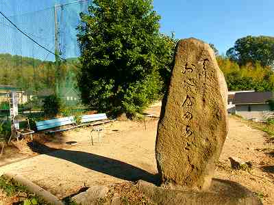 グラウンドの手前に天城陣屋の標柱とお茶屋跡の石碑とが建てられている。