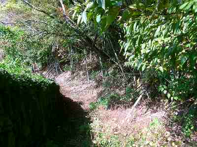 集落のすぐ北東側にそびえる城山城は、西側に堀切で区画はしているものの、傾斜した地形の部分がそのまま残されているようで、きちんと削平していないようである。