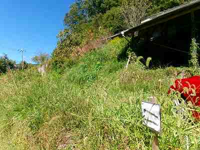 そこから道路を進んで行くと上の畑の間の道となっていく。これを進んで行ったところに城への入り口の案内があった。