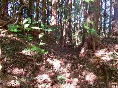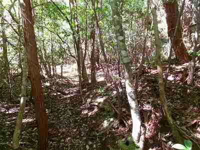 現在、山の中腹を削るようにして県道が通っており、この県道からなら、比高10mも登れば下の腰曲輪のところに到達することができる。