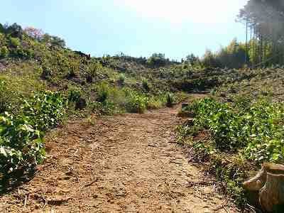 | 登城道入口。 | 正面にはげ山が見えてくる。勝山城はその先の山である。 |