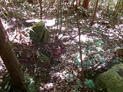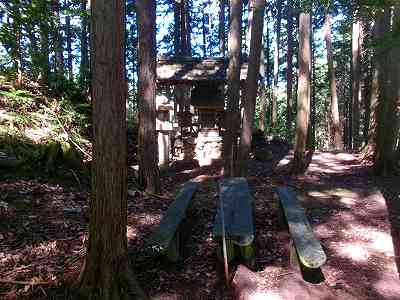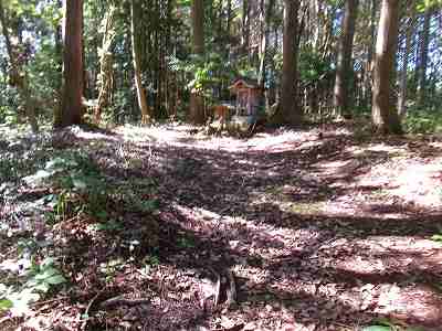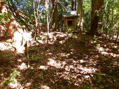 北側の土塁の下に祠が祭られていた。上記の道はこの祠に参詣するためのものだったのであろう。