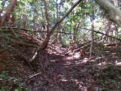 そこから少し東側に進んだところに城内に接続する道があるのだが、入口がヤブになっており、案内板も何もないので、よほど注意してみないと見つけることはできないであろう。