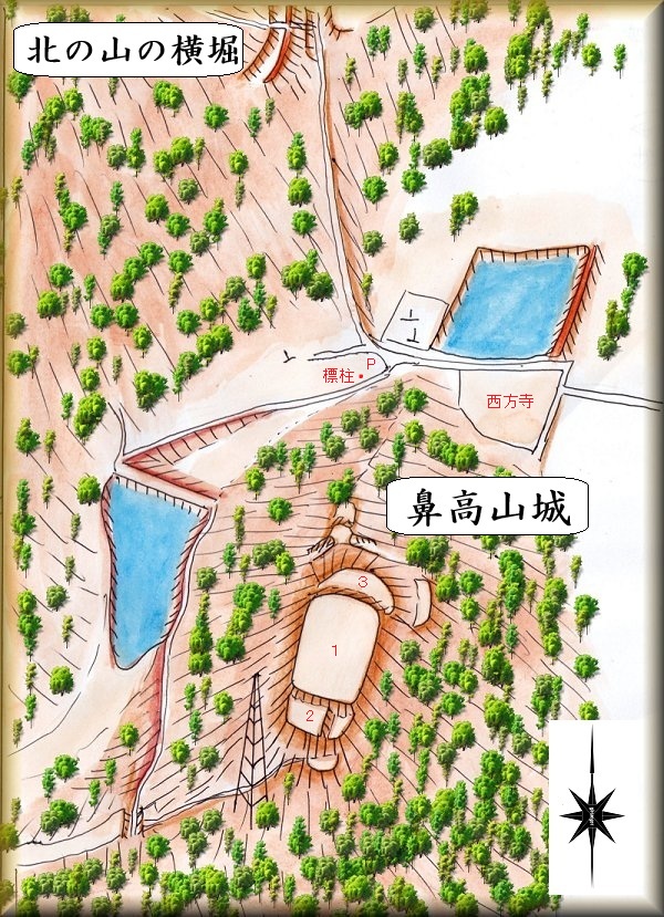 西方寺の南側の比高90m程の山稜が鼻高山城の跡なので、西方寺を目指していくとよい。