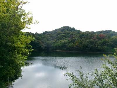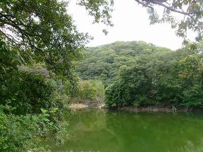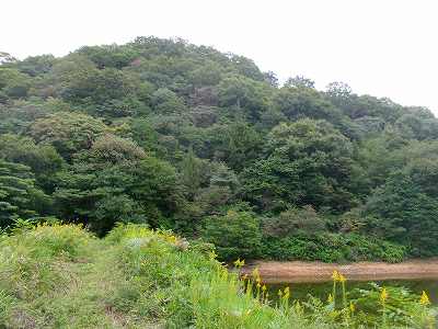 | 鼻高山城の入口を示す標柱 | 上の池越しに見る城山 |