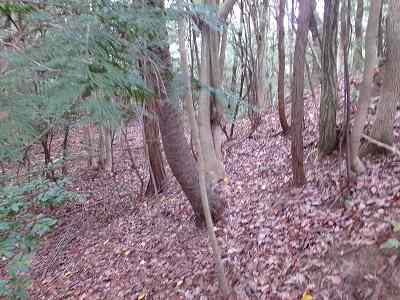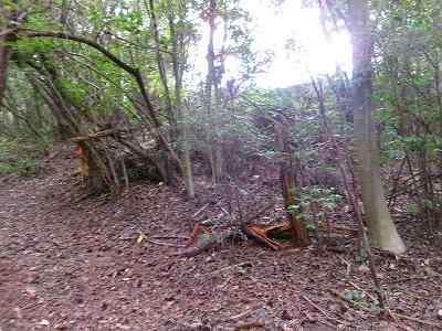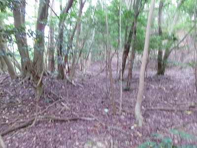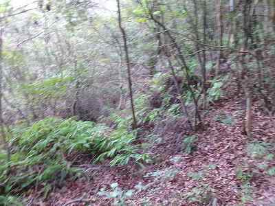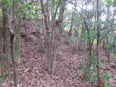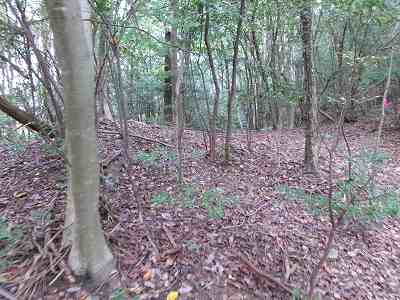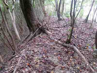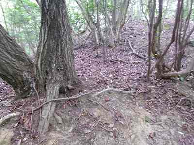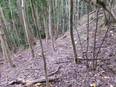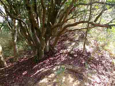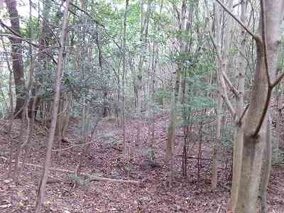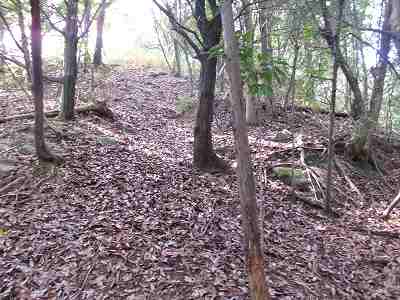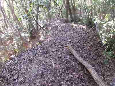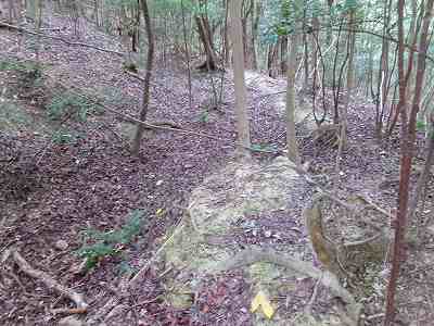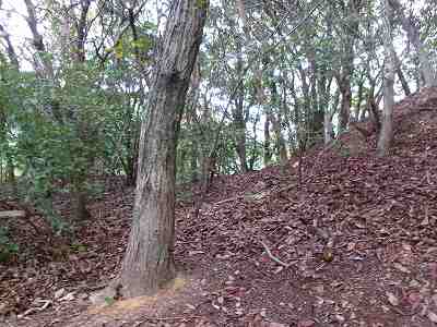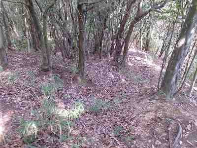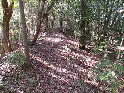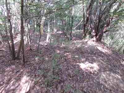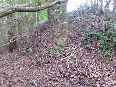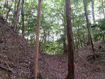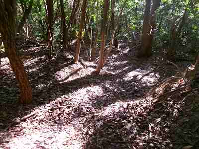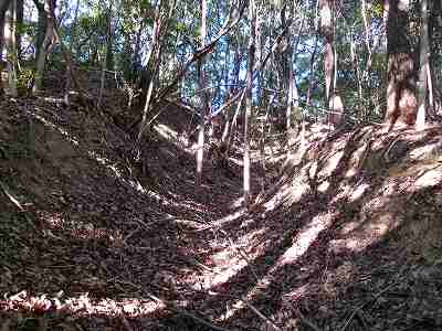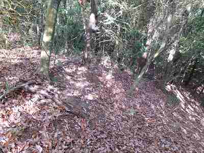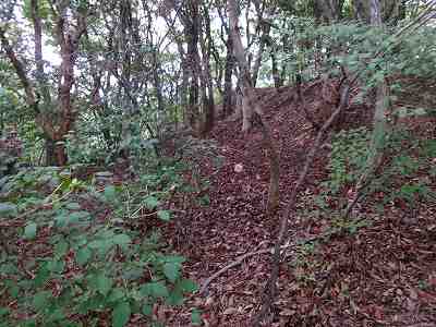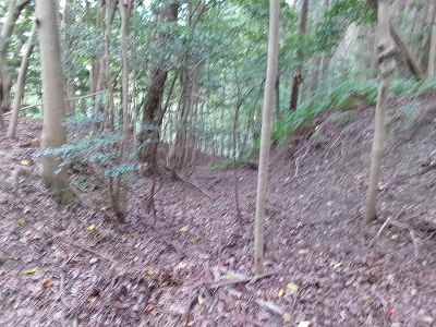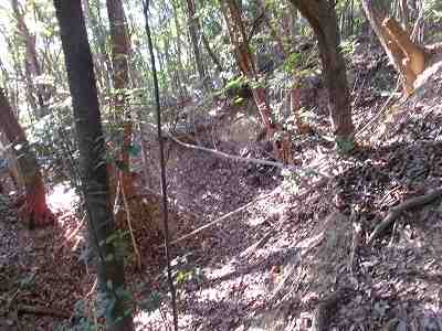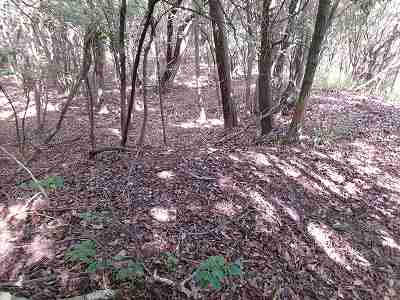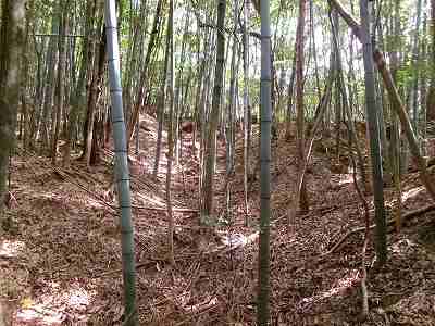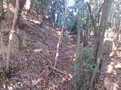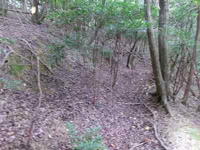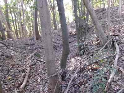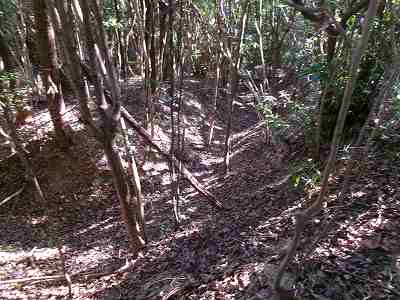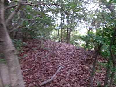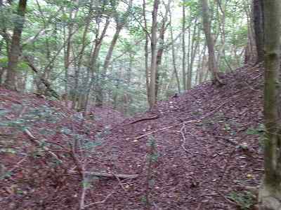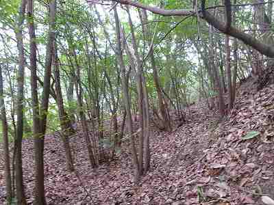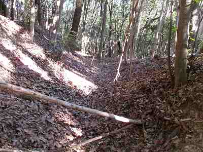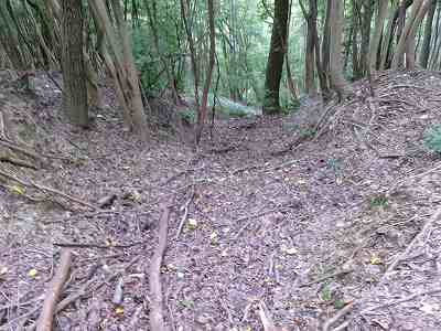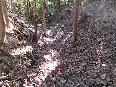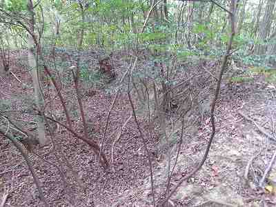 北側の山に進んで行くと暗部のところが切通状になっており、そこから南西の山稜に登っていったところに横堀が掘られていた。