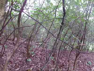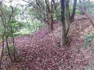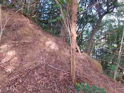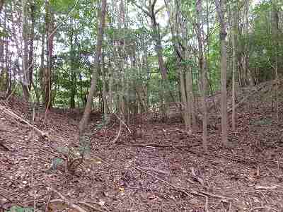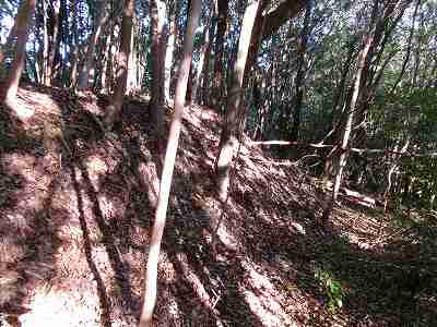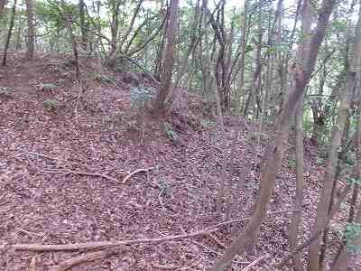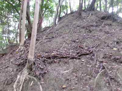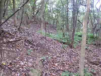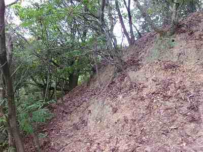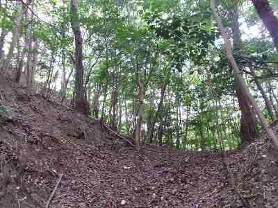 その先は道が分からなくなっているのだが、たいしてヤブでもないので比較的緩やかな斜面を登っていくとすぐに城塁と竪堀が見えてくる。