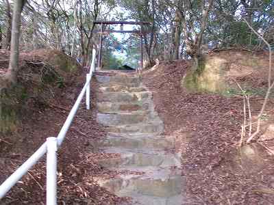 参道の階段を上っていくと、テラス状の小郭を経由して神社に到達する。