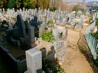墓地に向かう道に入って進んで行くと、墓地の下あたりに車を停められるスペースがあった。ここに車を停めて北側の墓地へと登っていく。