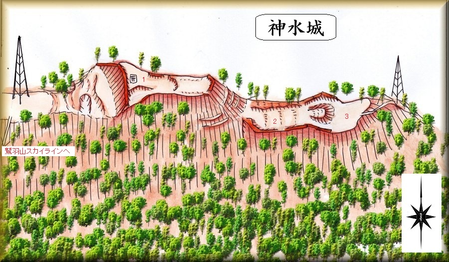 神水城は地形なりに山稜を削平した3郭構造の山城である。