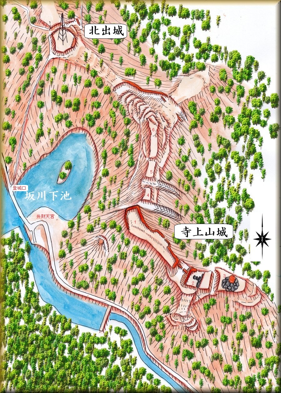 寺上山城は、坂川下池の上にそびえている山稜に築かれている。