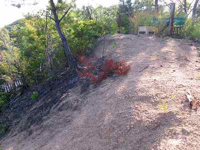 「この上が城跡だが、気を付けて登った方がええよ。前に途中の斜面からよじ登ろうとしたら転んでしまって肋骨を折ってしまったんだ」などとおっしゃるので気を付けて登っていく。