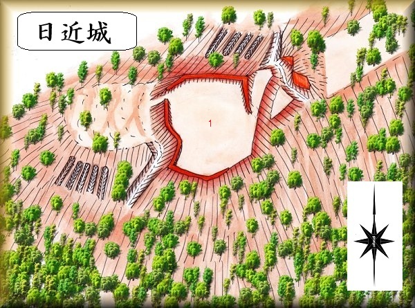 日近城は、鍛冶山城と北側に向かい合う比高60mほどの山稜に築かれている。