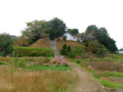 | 西門脇は、石垣ではなく版築の土塁で固めてあった。古代中国の城壁のようでもある。土塁といってもこれだけしっかり固めてあれば、石垣に匹敵する防御力を発揮するであろう。 | もう一度、後ろ側から西門を見たところ。 |