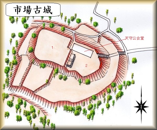 市場古城は総社市市場の比高15mほどの独立丘陵に築かれている。