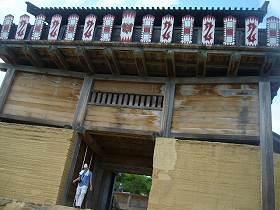 | 西方から遠望した西門。まるで模型のように見えるが、実際はとにかくでかい櫓門である。 | 西門に向う途中にある角楼。これも妙にでかい。石垣の間を柱が通っているのが珍しい。櫓部分が復元されていないのは、正確な考証ができなかったせいであろうか。 |