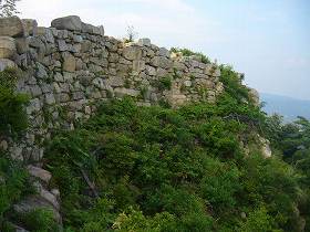 城塁に沿って歩いていくと、途中のあちこちに石垣が見られる。この山には岩石が非常に多く、そうした天然の素材を用いて石垣が構築されているのである。東の突出部辺りでは、石垣に屏風折れが見られ、高さも6mほどある。これらは本格的な石垣であり、古代の日本にこれほどの石垣を構築する技術があったというのが意外なほどである。