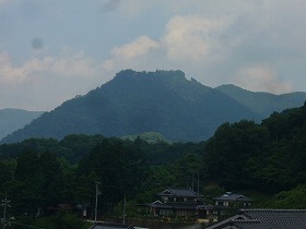 | 高梁川沿いの市街地の南側のはずれに山中鹿介の墓がある。富田城で降伏して毛利軍に連行された鹿介は、この辺で殺害されたのである。写真は墓のあるところから見た松山城。右手奥の方が大松山城であろう。 | 山中鹿介の墓。国道沿いに看板が出ているのですぐにわかる。 |