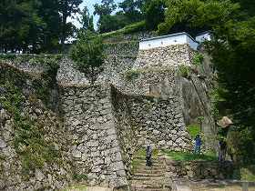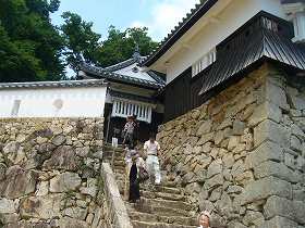 | 二の丸虎口を入ったところから本丸を見る。以前来た時には天守と二重櫓しかなかったが、平櫓や土塀など、けっこう復元が進んでいる。 | 本丸の入り口。暑い日なのに、けっこう観光客が訪れていた。以前来た時には、俺たち以外には誰もいなかったが、すっかり観光地になってしまったものだ。 |