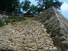 | 三の丸から厩曲輪と二の丸方向を見たところ。こちらも高石垣が印象的である。 | 二の丸下の石垣には、折れ部分を埋めるように積み上げた石垣があった。これは本来のものであろうか。どうしてこのように積み上げたのかよく分からないが、実に珍しい積み方である。 |