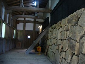 | 天守二層目。神棚が祭られている。 | 天守を降り、本丸から出て、裏手の大松山城を目指す。側面部の石垣もなかなか堅固である。 |