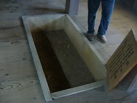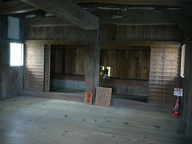 | 天守一層目にある囲炉裏。南条範夫の『廃城奇譚』では、これが抜け穴につながっているように書いてあったのだが、もちろんそれはフィクションであろう。 | 天守から見た本丸内部。 |