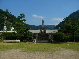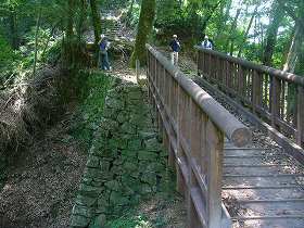 | 吊り橋から見た風景。見渡す限り山、山、山・・・・本当に山しか見えない。これでは絶景とは言い難い。眺望が利いているというわけでもなく、観光客が来るわけでもない。こんなところに吊り橋を造った理由が本当によく分からない。 | 吊り橋の入り口からさらに降りて行った所に番所の跡があった。このようなところまで石垣が積まれているとは・・・・ここまで来る人はめったにいないであろう。しかし、このようなきちんとした石垣が残っている。苦労してきた甲斐があったというものだ。 |