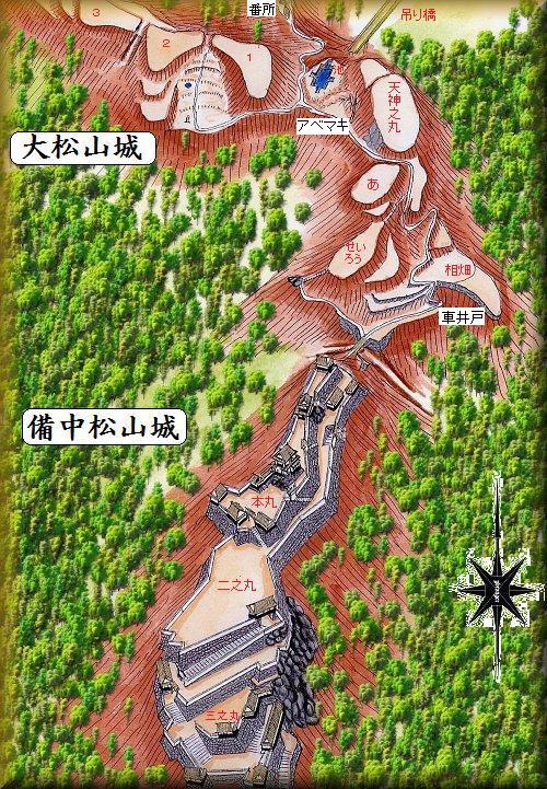 | (以前の記述) 松山城が正式名称だが、伊予の松山城と区別するために、備中松山城とか高梁城などと呼ばれている。松山という名の山は全国に無数にあるから、そこに築かれた城はみな松山城というわけだ。 この松山城の歴史は古く、鎌倉時代に築かれて以来、幾度となく戦乱を経験している。現在の天守は、天和元年(1681)に水谷氏によって建てられたものである。現存天守としては唯一の現存天守だがこの天守が残ったのは、あまりに急峻な山上にあったため、ずっと放って置かれたためである。そのため古写真で見ると、ぼろぼろで、半分崩れかけて悲惨な状況になっている。よく倒壊しなかったものだと思う。近年では櫓や塀も復原されつつあるらしい。 松山城と言えば有名なのはなぜか大石蔵助で、元禄年間に水谷氏が廃絶になったときに、城の受け取りに来たのが彼だったのである。それゆえか、山道の途中に「大石蔵助腰掛け石」というのがある。そういえば「危険、猿と目を合わすな」という立て札も山中にあった。野生の猿がけっこう生息しているらしい。私の弟は以前然1人でここで野宿したことがあるが、夜中に猿の大群が天守の上や周りで大騒ぎし、かなり怖かったという。とてもまねできん。 (松山城の歴史) 松山城の歴史は古い。備中松山は伯備往来の主要な街道沿いにあり、この城を押さえることには大きな意味があったらしく、かなり早い時期からこの山は注目されていたようだ。 ここに最初に城を築いたのは、鎌倉時代、承久の変で戦功を挙げて備中に所領を得た、秋葉重信であったという。秋葉氏は相模の三浦一族であったというから、関東から遥か山陽までやってきたのである。この時、秋葉氏は大松山城を築いたというが、これはあくまでも詰めの城であって、平素の居館は山麓のどこかに置いていたのであろう。 正慶元年(1332)頃、備後三好一族であった高橋宗康が松山城に入城した。この宗泰によって城域が拡大され、小松山(近世松山城)の部分まで城として取り込まれたという。その頃からそれほどの城域を持っていたとすると、南北朝期の城としては、かなり広大な城であったといえるだろう。 室町時代になると、備中守護となった高越師秀が在城する。しかし、足利尊氏に属した秋葉氏が奪還して、再び城主の座に収まった。 しかし、枢要の地にある松山城ではその後も騒乱が繰り返され、城主はめまぐるしく代わっている。足利家臣上野信孝、庄高資らであるが、やがて三村氏が城主となる。この三村氏こそが、戦国大名としてこの地域に勢力を誇った一族であり、三村国親、元親らの名前が知られている。しかし、三村元親は備前の新興勢力宇喜多直家に明禅寺合戦で破れ、西からは毛利氏の圧力を受け、結局、天正3年(1575)、毛利氏の攻撃によって松山城を脱出、山麓の松蓮寺で自殺した。これによって三村氏時代は終焉を迎える。 それ以後、松山城は毛利氏の持ち城となり、城には、天野五郎左衛門、桂民部大輔らといった毛利氏の家臣が城代となっていた。 慶長5年(1600)、関が原の合戦で西軍の総大将に祭り上げられた毛利輝元は失脚し、長門・周防二国に押し込められ、備中の所領を失ってしまう。その後の松山は幕府の直轄領となった。この時に代官として赴任した小堀正次、息子の小堀遠州政一は小松山の城郭の改修を行ったという。 天和3年(1617)には、鳥取から6万5千石の大名として移封された池田備中守長幸が城主となる。だが、寛永9年(164)には、備中成羽藩の水谷勝家が移封されてくる。水谷氏は城の改修を積極的に行い、現存の天守、二重櫓、土塀といった建造物は、水谷時代に築かれたものだといわれる。 水谷氏といえば、その先祖は、下野久下田城にいた水谷蟠龍斎であり、チバラギ人としては妙な親しみを感じる。関東からこのような場所に移封されていたとは、ちょっと意外でもある。ところで、水谷氏が関東にいた頃には、城に石垣を用いることなどまったくといっていいほどなかったのだが、この城では見事な高石垣を随所に見ることができる。いったいいつの間に水谷氏は石垣の築造法を覚えたものであろうか。 この水谷氏は、嗣子なく改易となる。その際の城明け渡しに、赤穂藩の大石蔵之助が訪れたという話はとても有名である。水谷氏の後は、安藤氏、石川氏、板倉氏と続く。5万石の板倉氏時代は8代に渡って安定して続き、やがて明治維新を迎えるに至る。 |