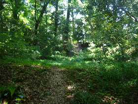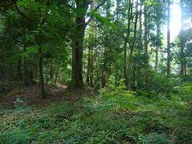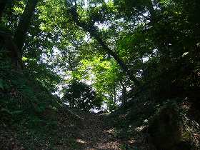 | それをさらに進んでいくと、(あ)の郭と天神の丸との間の堀切のところに出た。ここから天神の丸の側面を通って行った先の山が大松山城ということになる。その途中には岩盤むき出しの部分やアベマキの巨木があった。細い山道のすぐ脇は断崖のような急斜面である。そのすぐ先の「←大松山城」の案内板に従って左手の山に進んでいく。 | 大松山城には1と2の主要な郭があり、その間の部分が緩やかな斜面の谷戸部となっている。写真はその谷戸部から奥の方を見たところ。歩いていても、どこが大松山城なのかよく分からなかったのだが、この谷戸部の入り口に、「大松山城跡」の石碑が建っていたので、かろうじて「ここが大松山城なのか・・・」と分かったのであった。 |
