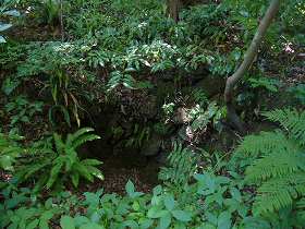 | 谷戸部にあった井戸。現在も水をたたえている。石組みで囲まれたしっかりとした井戸である。 | 3の郭。大松山城は、段郭を並べただけの、単純な構造の山城である。堀切も小さなものしかなく、いかにも古いタイプの山城といった印象である。 |