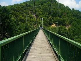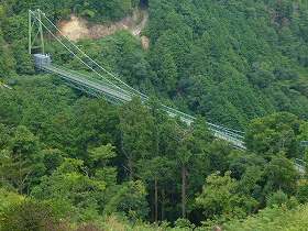 この池から下に降っていくと、非常に大きな吊り橋がある。これも意外だ。このような山の奥にこんな立派な吊り橋を造っても、訪れる人はほとんどいないであろう。観光用にしてはあまりにも寂れすぎている。通行上の必要性があったとも思われず、なんのために造ったのか、よく分からない吊り橋である。