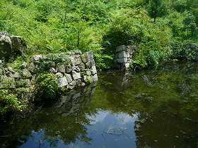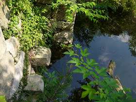| 1の郭の先端まで行ったら、下に大きな吊り橋が見えた。なんでこのようなところにこのような立派な吊り橋があるのであろうか・・・・。実に意外である。 | 天神の丸との間の平場には石垣で囲まれた池がある。かなりの水量であり、これだけあれば籠城にも十分堪えられそうだ。これは近世の所産であろう。池の四方には舟入のような形をした窪みがある。水くみ場の跡であろうか。 |