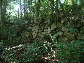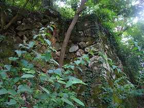 | 再び近世松山城の方に戻ってくる。途中、今度は、相畑の方の道を通ってきた。すると、途中にこのような低い石垣があちこちに見られる。これは中世段階の遺構なのであろうか。 | このように石垣はあちこちに見られる。 |